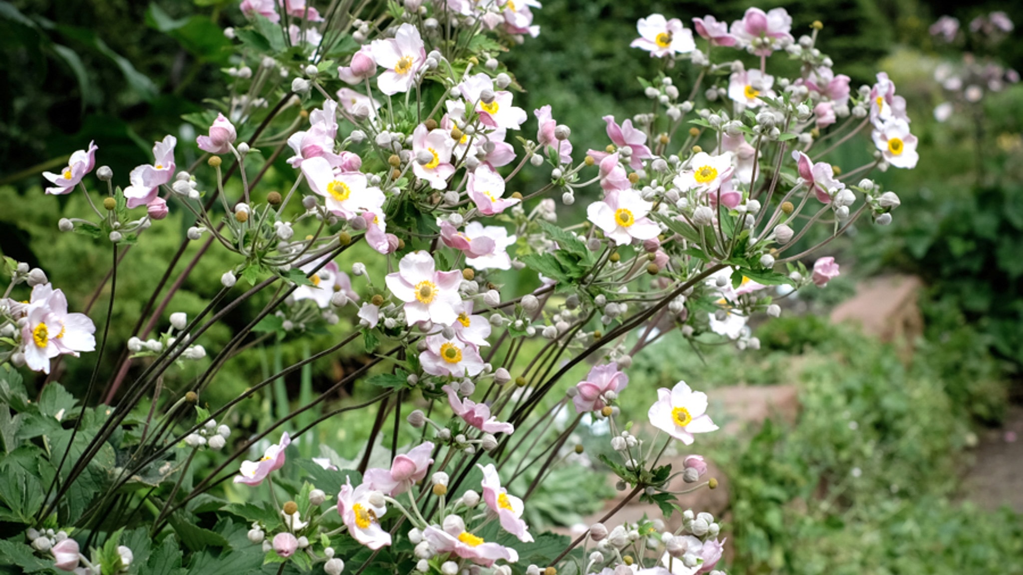 Die Herbstanemone ‚Robustissima‘ (Anemone hupehensis) ist für mich der absolute Star unter den Schattenstauden. Ihre schalenförmigen, zart rosafarbenen Blüten mit den gelben Staubgefäßen stehen in lockeren Dolden über dem dunkelgrünen, dreiteiligen Laub. Von August bis Oktober kann man ihren silbrigen Schimmer bestaunen.