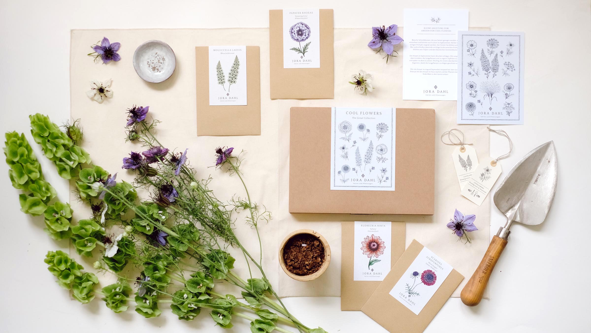 Wir haben versucht, wieder ganz besondere Sorten für euch zu finden. Satte, kreischende Farben sind nicht unser Ding, deswegen gibt es dieses Jahr den wohl momentan schönsten Mohn auf dem Planeten: ‚Amazing Grey‘ beeindruckt in mystischen grau-lila Tönen. Rudbeckia ‚Sahara‘ hat das wohl unglaublichste Farbspektrum: tiefes Samtrot, Karamell, Ocker und Apricot-Kupfer. Der Rittersporn „Fancy Smokey Eyes“ changiert zwischen silbrigem Weiß und zartem Lavendel, eine tief purpurfarbene Skabiose sorgt für ein wenig Dramatik und die irische Muschelblume ist ein Muss in jedem Schnittblumengarten. Ein stylischer Begleiter in jedem Strauß, aber auch solo wunderschön in ihrer architektonisch-ornamentalen Gestalt.