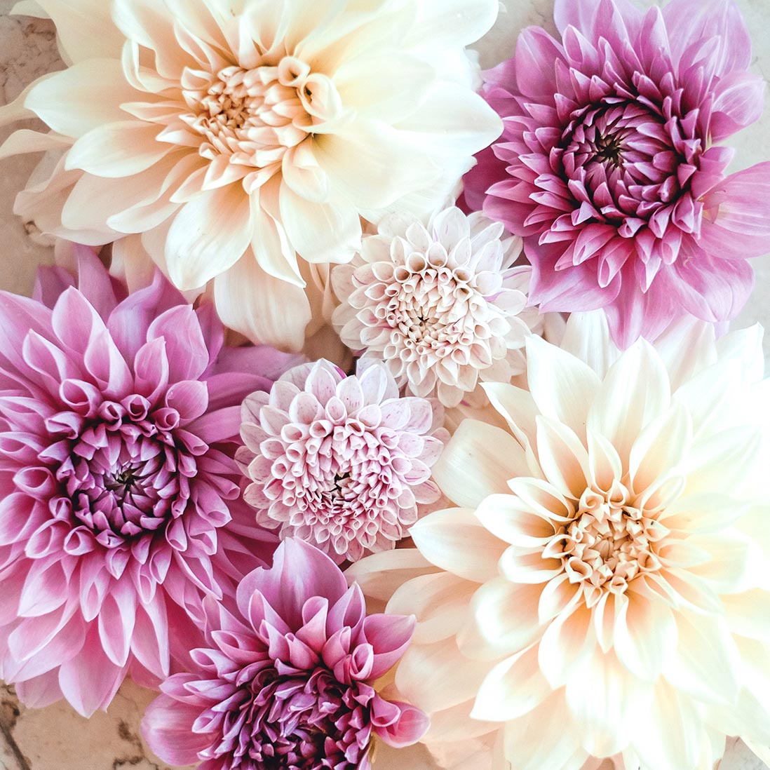 Elegant cream tones meet subtle lavender pink. The two dinnerplate dahlias impress with plate-sized blooms.