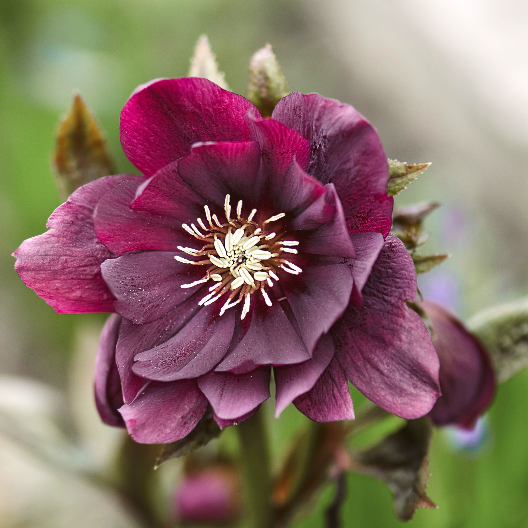 Helleborus orientalis ‘Double Ellen Purple’ enchants with its semi-double magnificent aubergine-coloured flowers! Lentil roses have a few fantastic characteristics that set them apart from other perennials. They are evergreen, flower at a time of year when not much else is flowering in the garden and usually grow very well in partial shade and shade (even under trees!). The soil should nevertheless be well-drained and rich in nutrients so that these noble plants develop their full beauty.