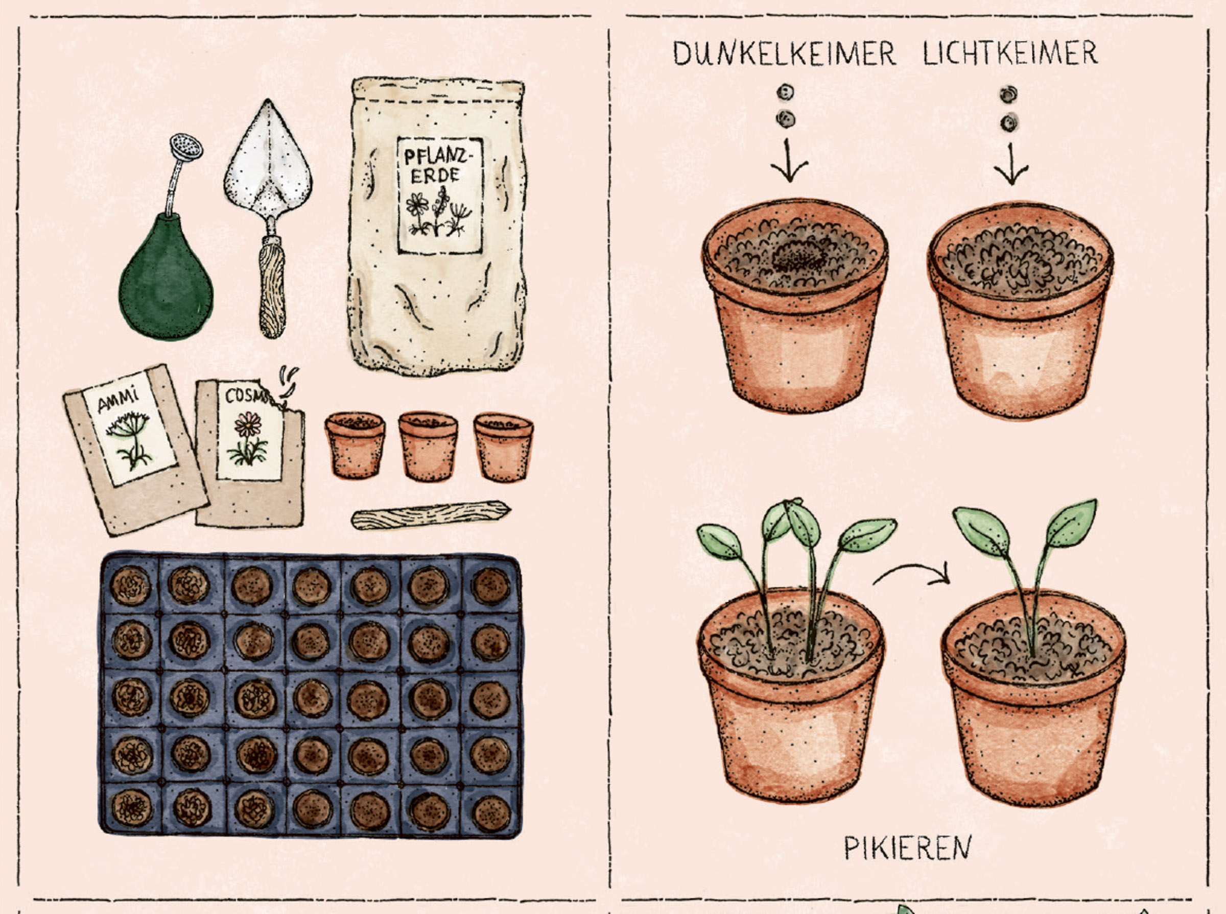 1. Pour soil into the pots, water gently and put a seed in a small hole that you push in with a pen (except for light sprouts: just sprinkle them on the soil).