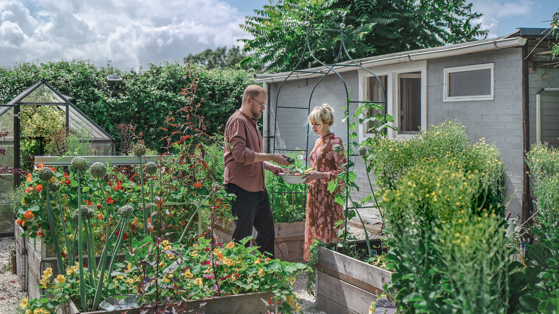Wir haben unseren Garten im Dezember 2018 übernommen. Das heißt, wir hatten noch einige Winterwochen vor uns, in denen wir Pläne geschmiedet, Moodboards gebastelt und „Gardener’s World“ – eine britische Serie mit Gartenexperte Monty Don – geschaut haben. Es gab immer einen Plan für die Optik der Laube, die Aufteilung des Gartens sowie die Gemüse- und Blumenauswahl. Im ersten Gartenjahr haben wir erst einmal abgerissen, ausgebuddelt und zurückgebaut. Das war anstrengend, teilweise sogar frustrierend, weil es am Ende nicht viel besser aussah als vorher. Da sind wir ziemlich an unsere Grenzen gestoßen. Manchmal sind wir am Wochenende um 19 Uhr nach Hause gefahren, haben kurz geduscht und sind sofort ins Bett gefallen. Verrückt, an welchen Stellen man überall Muskelkater bekommen kann. Zum Glück haben wir viele tolle Freunde, die richtig Lust hatten, mit anzupacken. Zu zweit wäre das nicht möglich gewesen – zumindest nicht in der Zeit.