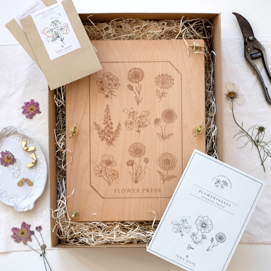 Die Blumenpresse wird in einer Berliner Werkstatt per Hand gefertigt und kommt zu euch im schönen Geschenkkarton mit Anleitung.