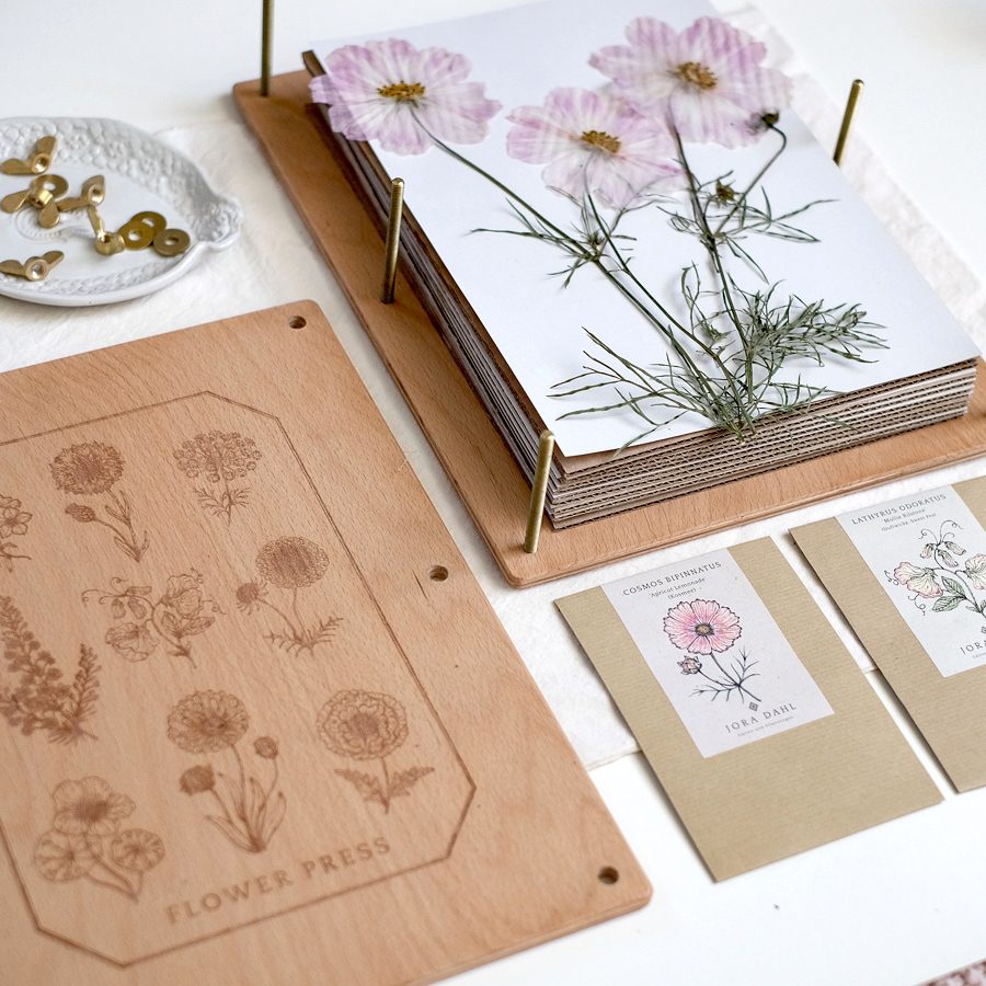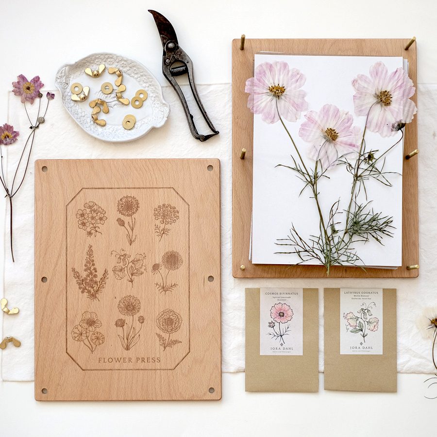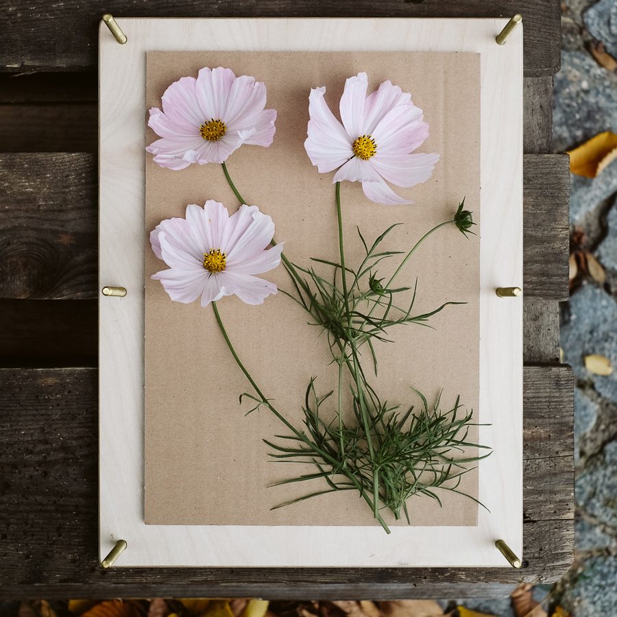 Aus wunderschönem geöltem Buchenholz geschaffen, geprägt mit den Illustrationen unserer Blumen und befüllt mit hochwertigem Karton und Löschpapier ist es eine wirkliche Premium-Blumenpresse geworden. Ihr könnt damit ein volles A4-Format pressen und im Bilderrahmen mit Passepartout ergeben sich wandfüllende Kreationen.
