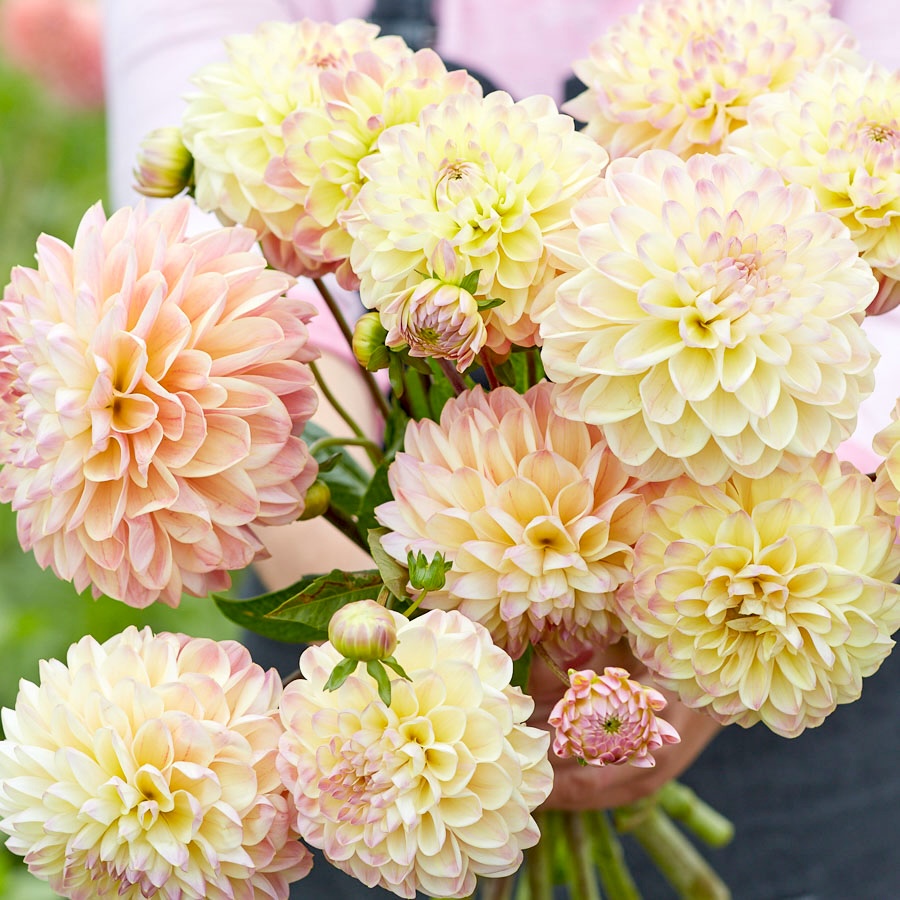 Die Dahlie ‘Hapet Pastel’ ist eine dekorative Dahlie in zarten Pastelltönen aus Pfirsichrosa und zartem Buttergelb. Ihre runden und kompakten Blüten werden von langen und kräftigen Stielen getragen. Die romantischen Farben verleihen ihr ein verträumtes Aussehen und macht sie zu einer schönen Grundlage für Kombinationen mit anderen pastellfarbenen Dahlien.