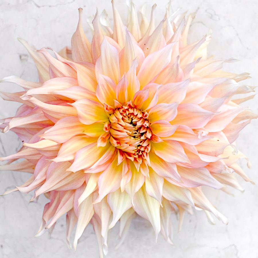 In der Reihe der riesigen Teller-Dahlien, darf ‘Omega’ nicht fehlen. Ihre pfirsichfarbene, leicht gestreifte Blüte und ihre spitz zulaufenden Blütenblätter machen sie einzigartig. Im Garten wie im Bouquet ist diese Dahlie eine spektakuläre Erscheinung.