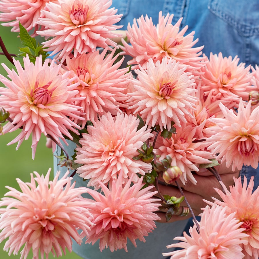 Die Kaktus-Dahlie ‚Preference‘ besticht mit spitzen Blütenblättern in zartem lachsrosa, das in der Mitte ins Apricot übergeht. In Verbindung mit Dahlien in anderen Formen, bringt sie durch ihre besonderen Blüten Abwechslung und Lebendigkeit ins Beet und in Bouquets.