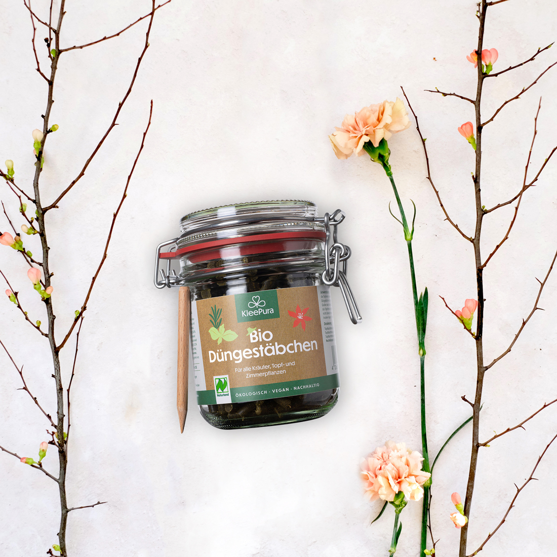 Bio-zertifizierte KleePura Düngestäbchen für Topf- und Zimmerpflanzen im Drahtbügelglas