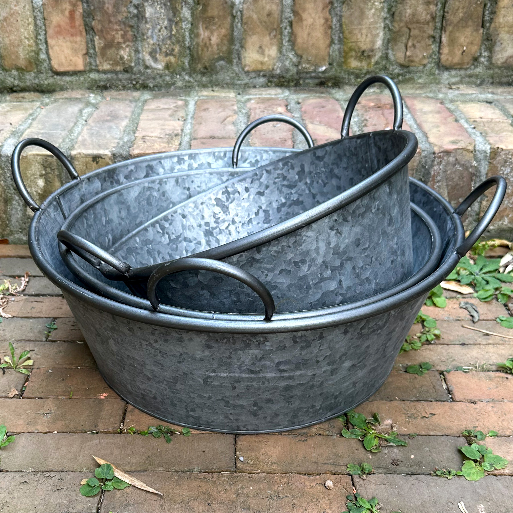Drei wunderschöne Zinktöpfe, ideal zum Pflanzen von Ranukeln, Blumenzwiebeln und einjährigen Sommerblumen. Die Vorteile: Man hat eine bessere Kontrolle über das Wachstum der Jungpflanzen als im Beet und man kann wunderschöne Pflanzbilder schaffen, indem man ein paar Pflanztöpfe zusammenschiebt.
